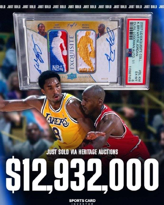 北京时间2025年8月25日,据据The Athletic报道,一张独一无二的2007-08赛季Upper Deck Exquisite Collection系列乔丹与科比双LogoMan签名补丁卡,在周日凌晨通过Heritage Auctions拍卖行以1293.2万美元的价格售出。
